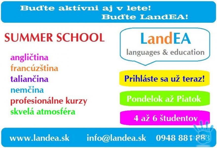 Jazyková škola LandEA v Petržalke ponúka letné týždenné intenzívne kurzy Angličtiny, francúzštiny, nemčiny a Taliančiny v mesiacoch júl a august 2014.
